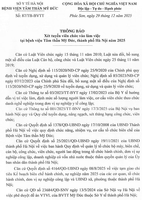 Bệnh viện Tâm thần Mỹ Đức thông báo xét tuyển viên chức năm 2025 cụ thể như sau: