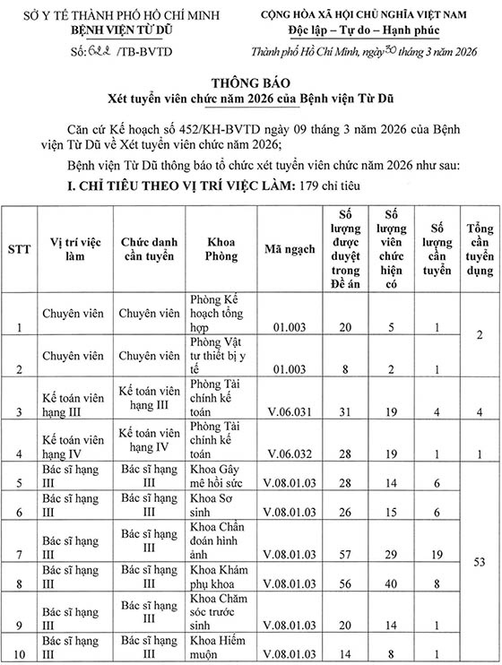 Bệnh viện Từ Dũ thông báo tổ chức xét tuyển viên chức năm 2026 như sau: