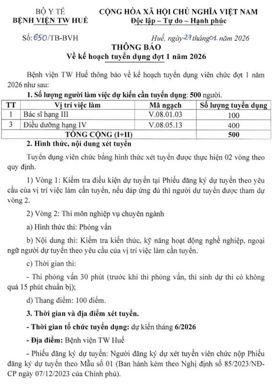 Bệnh viện TW Huế thông báo về kế hoạch tuyển dụng viên chức đợt 1 năm 2026 như sau: