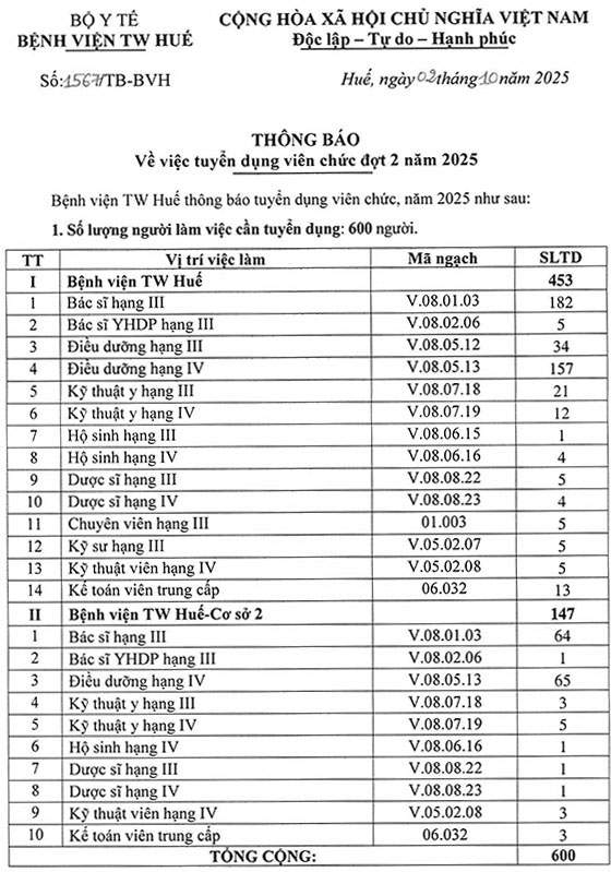 Bệnh viện TW Huế thông báo tuyển dụng viên chức năm 2025, như sau: