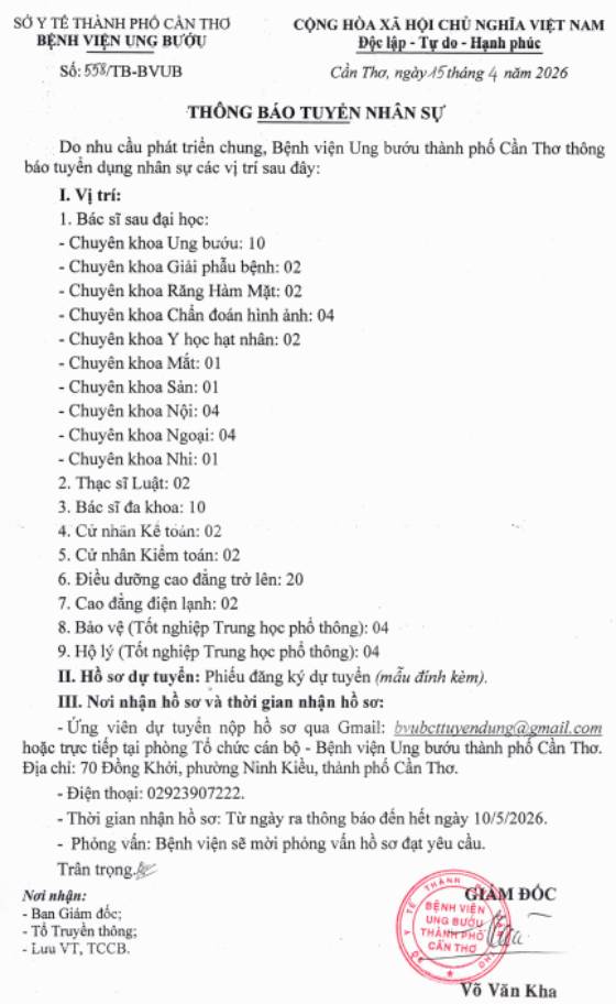 Do nhu cầu phát triển chung, Bệnh viện Ung bướu thành phố Cần Thơ thông báo tuyển dụng nhân sự các vị tí sau đây: