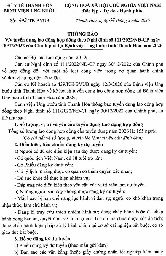 Bệnh viện Ung bướu tỉnh Thanh Hóa thông báo tuyển dụng lao động hợp đồng theo Nghị định số 111/2022/NĐ-CP ngày 30/12/2022 của Chính phủ, cụ thể như sau: