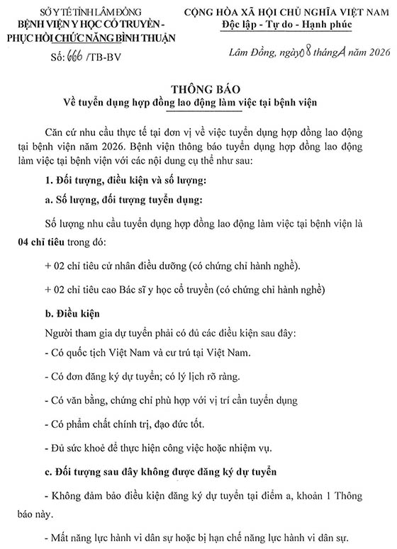 Bệnh viện Y học Cổ truyền – Phục hồi Chức năng Bình Thuận tuyển dụng hợp đồng lao động