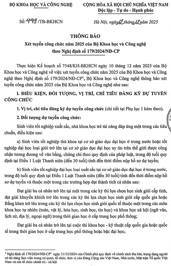 Thực hiện Kế hoạch số 7548/KH-BKHCN ngày 10 tháng 12 năm 2025 của Bộ Khoa học và Công nghệ về việc xét tuyển công chức năm 2025 của Bộ Khoa học và Công nghệ theo Nghị định số 179/2024/NĐ-CP, Bộ Khoa học và Công nghệ thông báo xét tuyển công chức năm 2025 của Bộ Khoa học và Công nghệ như sau: