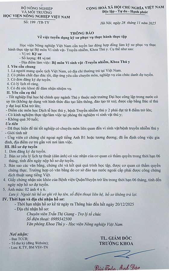 Bộ môn Vi sinh vật – Truyền nhiễm, Khoa Thú y, Học viện Nông nghiệp Việt Nam tuyển dụng lao động hợp đồng