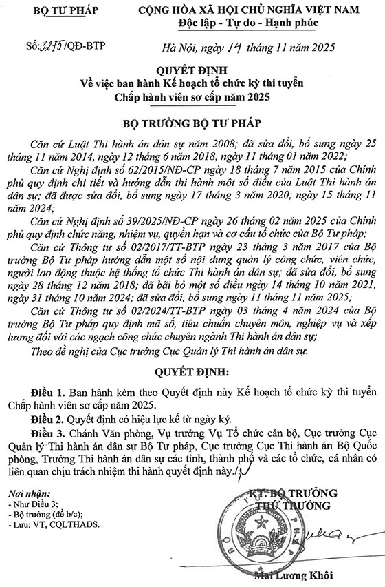 Bộ Tư Pháp ban hành kế hoạch tổ chức kỳ thi tuyển Chấp hành viên sơ cấp năm 2025, cụ thể như sau: