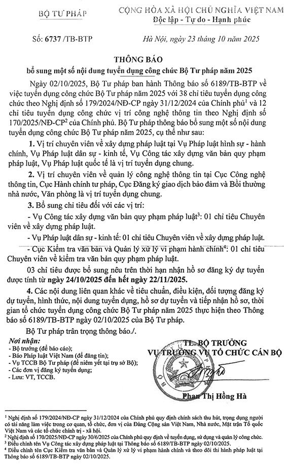 Ngày 02/10/2025, Bộ Tư pháp ban hành Thông báo số 6189/TB-BTP về việc tuyển dụng công chức Bộ Tư pháp năm 2025 với 38 chỉ tiêu tuyển dụng công chức theo Nghị định số 179/2024/NĐ-CP ngày 31/12/2024 của Chính phủ và 12 chỉ tiêu tuyển dụng công chức vị trí công nghệ thông tin theo Nghị định số 170/2025/NĐ-CP của Chính phủ. Bộ Tư pháp thông báo bổ sung một số nội dung tuyển dụng công chức Bộ Tư pháp năm 2025.