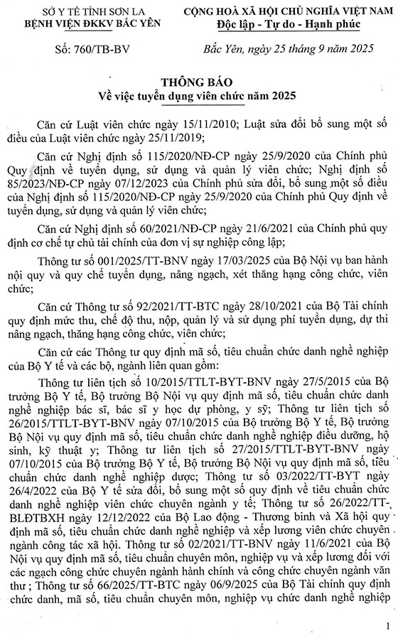 Bệnh viện đa khoa khu vực Bắc Yên thông báo tuyển dụng viên chức năm 2025, cụ thể như sau: