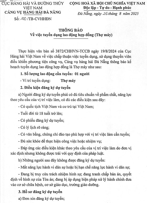 Thực hiện văn bản số 3872/CHHVN-TCCB ngày 19/8/2024 của Cục Hàng hải Việt Nam về việc chấp thuận việc tuyển dụng, sử dụng thuyền viên điều khiển phương tiện công vụ, Cảng vụ hàng hải Đà Nẵng thông báo kế hoạch tuyển dụng lao động hợp đồng là Thợ máy như sau: