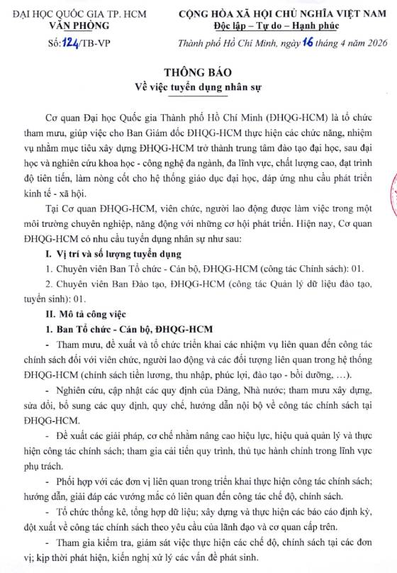 Cơ quan ĐHQG-HCM có nhu cầu tuyển dụng nhân sự như sau:
