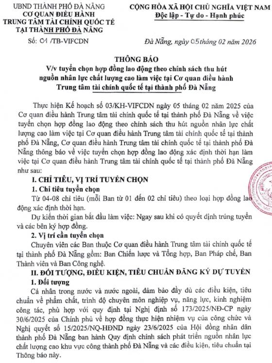 Cơ quan điều hành Trung tâm tài chính quốc tế tại thành phố Đà Nẵng thông báo về việc tuyển chọn hợp đồng lao động xác định thời hạn làm việc tại Cơ quan điều hành Trung tâm tài chính quốc tế tại thành phố Đà Nẵng như sau: