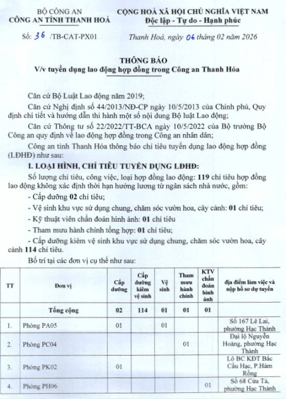 Công an tỉnh Thanh Hóa thông báo chỉ tiêu tuyển dụng lao động hợp đồng (LĐHĐ) như sau: