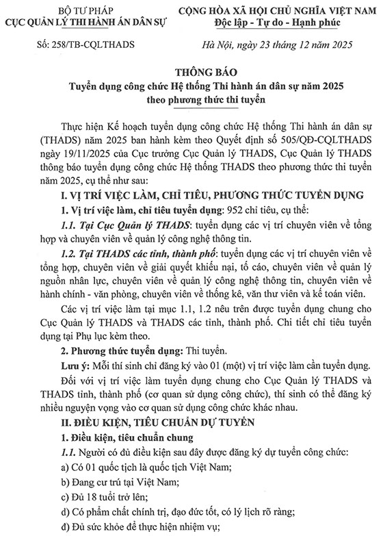 Cục Quản lý THADS thông báo tuyển dụng công chức Hệ thống THADS theo phương thức thi tuyển năm 2025, cụ thể như sau: