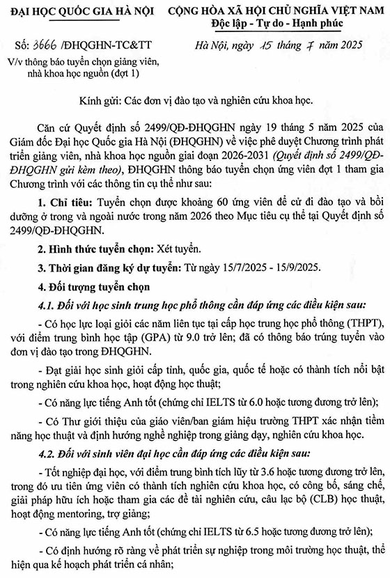 Thực hiện Quyết định số 2499/QĐ-ĐHQGHN ngày 19/5/2025 của Giám đốc Đại học Quốc gia Hà Nội về việc phê duyệt Chương trình phát triển giảng viên, nhà khoa học nguồn giai đoạn 2026-2031, ĐHQGHN thông báo tuyển chọn giảng viên, nhà khoa học nguồn đợt 1 tham gia Chương trình với các thông tin cụ thể sau:
