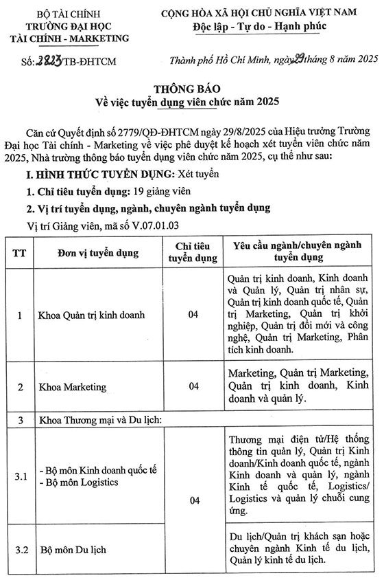 Căn cứ Quyết định số 2779/QĐ-ĐHTCM ngày 29/8/2025 của Hiệu trưởng Trường, Đại học Tài chính – Marketing về việc phê duyệt kế hoạch xét tuyển viên chức năm 2025, Nhà trường thông báo tuyển dụng viên chức năm 2025, cụ thể như sau: