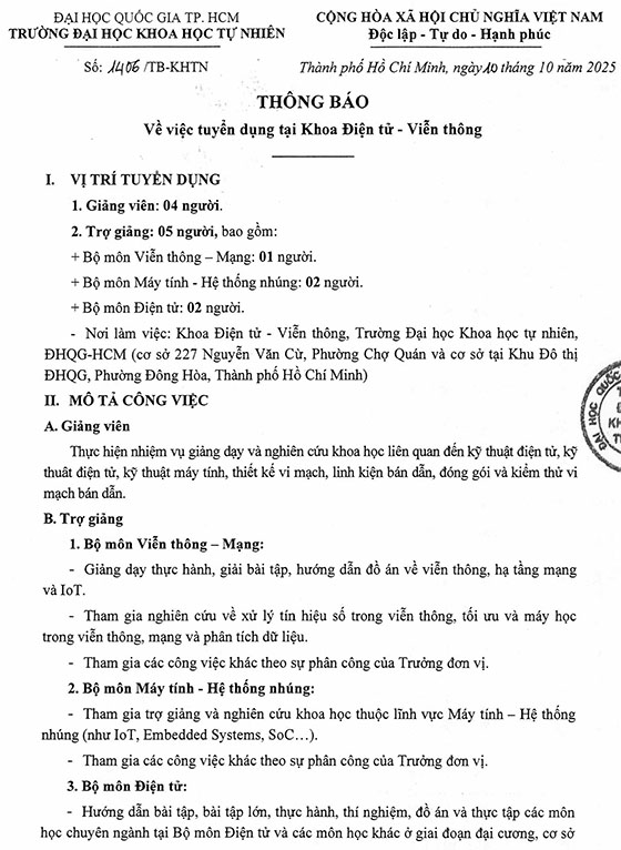 Trường Đại học Khoa học Tự nhiên, Đại học Quốc gia TP. HCM thông báo về việc tuyển dụng tại Khoa Điện tử – Viễn thông, cụ thể như sau: