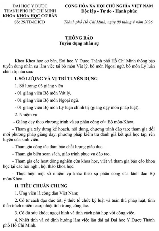 Khoa Khoa học cơ bản, Đại học Y Dược Thành phố Hồ Chí Minh thông báo tuyển dụng nhân sự làm việc tại bộ môn Vật lý, bộ môn Ngoại ngữ, bộ môn Lý luận chính trị như sau: