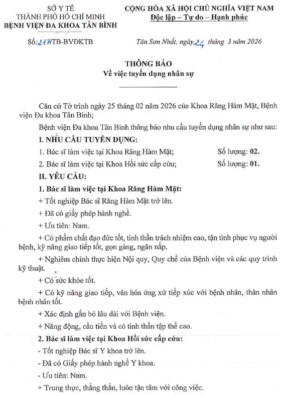 Khoa Răng, Hàm, Mặt, Bệnh viện Đa khoa Tân Bình thông báo nhu cầu tuyển dụng nhân sự, như sau: