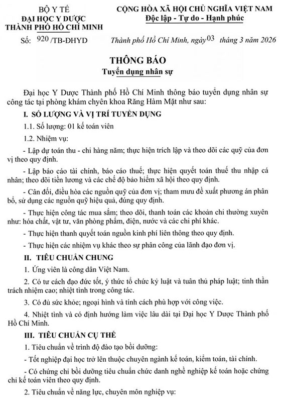 Đại học Y Dược Thành phố Hồ Chí Minh thông báo tuyển dụng nhân sự công tác tại phòng khám chuyên khoa Răng Hàm Mặt như sau: