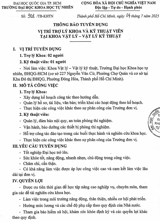 Khoa Vật lý – Vật lý kỹ thuật, Trường Đại học Khoa học tự nhiên, ĐHQG-HCM thông báo tuyển dụng, cụ thể như sau: