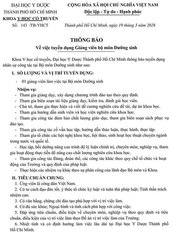 Khoa Y học cổ truyền, Đại học Y Dược Thành phố Hồ Chí Minh thông báo tuyển dụng nhân sự công tác tại Bộ môn Dưỡng sinh như sau: