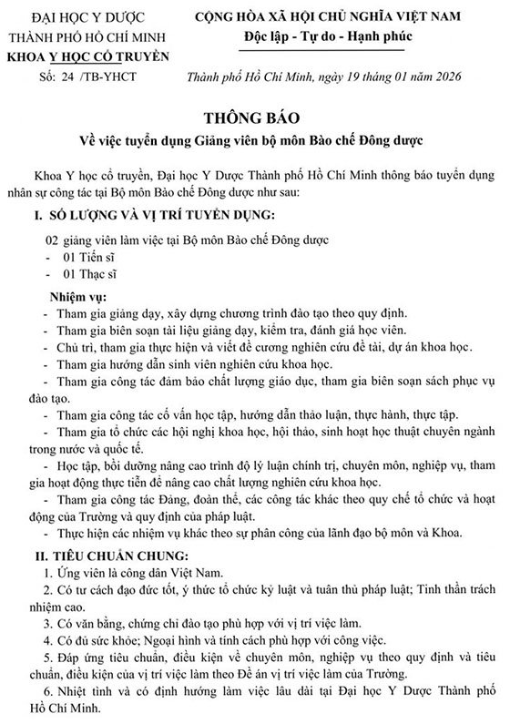 Khoa Y học cổ truyền, Đại học Y Dược Thành phố Hồ Chí Minh thông báo tuyển dụng nhân sự công tác tại Bộ môn Bảo chế Đông dược như sau: