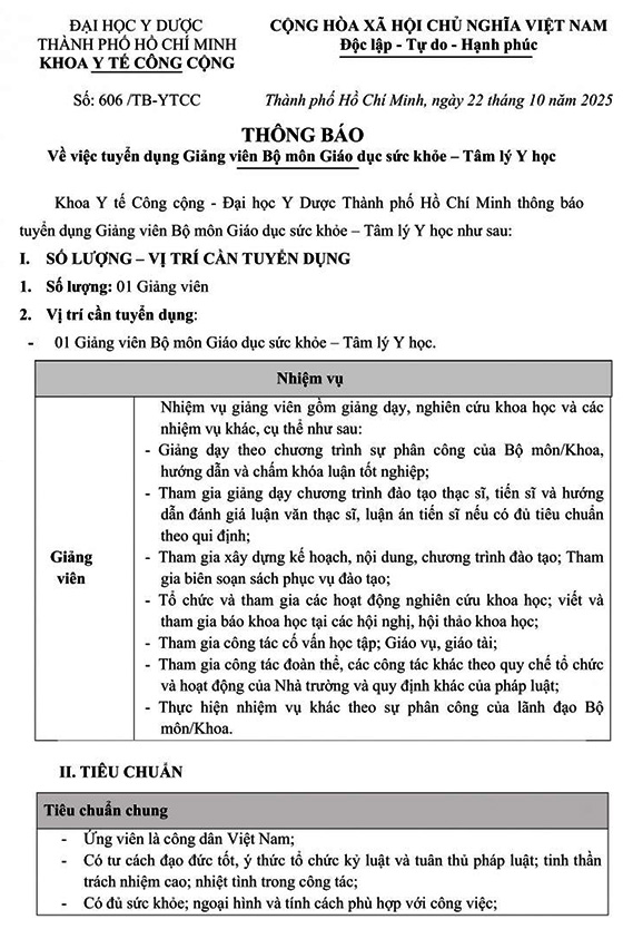 Khoa Y tế Công cộng – Đại học Y Dược TP. HCM tuyển dụng Giảng viên, như sau: