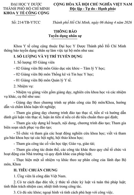 Khoa Y tế công cộng thuộc Đại học Y Dược TP. HCM tuyển dụng nhân sự