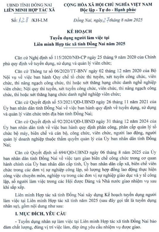 Liên minh Hợp tác xã tỉnh Đồng Nai xây dựng Kế hoạch tuyển dụng người làm việc tại Liên minh Hợp tác xã tỉnh năm 2025 (sau đây gọi tắt là tuyển dụng nhân sự), gồm nội dung như sau:
