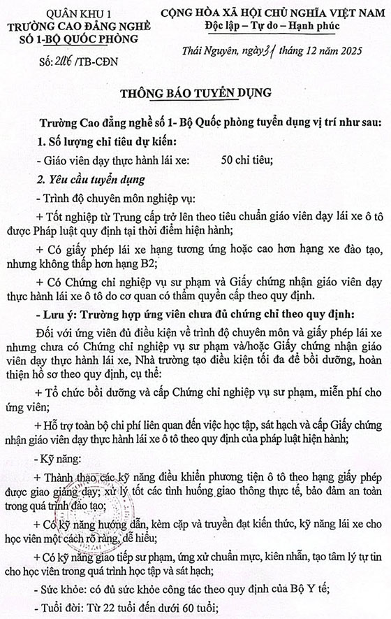 Trường Cao đẳng nghề số 1- Bộ Quốc phòng tuyển dụng Giáo viên