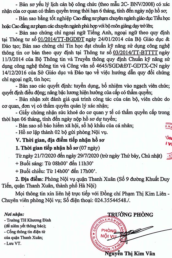 Phòng Nội vụ quận Thanh Xuân, TP.Hà Nội tiếp nhận hồ sơ giáo viên đăng ký trường Tiểu học Khương Đình năm 2020 như sau: