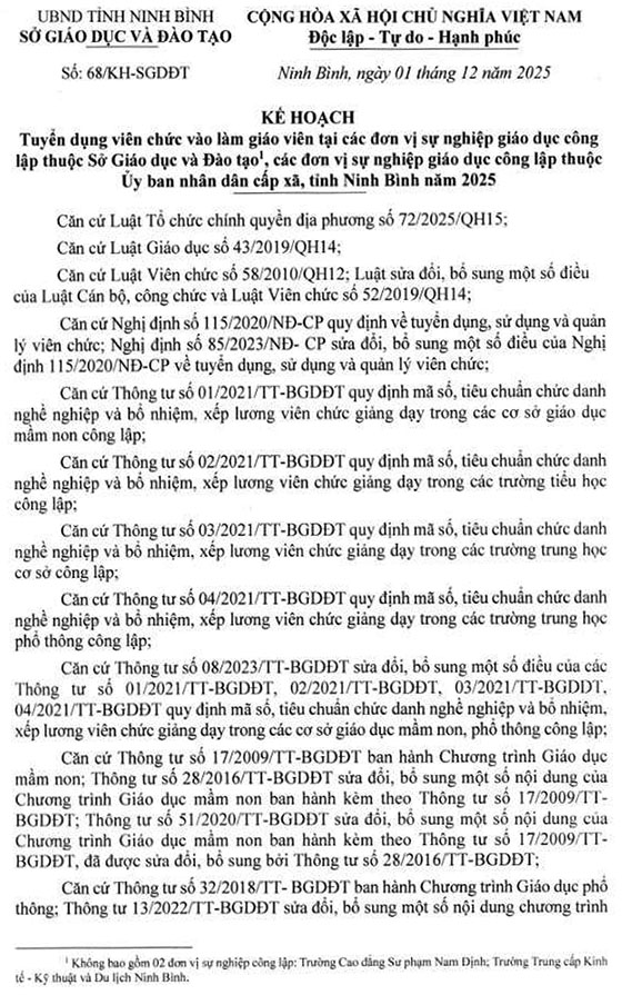Sở GDĐT tỉnh Ninh Bình xây dựng Kế hoạch tuyển dụng viên chức vào làm giáo viên tại các đơn vị sự nghiệp giáo dục công lập thuộc Sở GDĐT, các đơn vị sự nghiệp giáo dục công lập thuộc UBND cấp xã, tỉnh Ninh Bình, năm 2025 như sau: