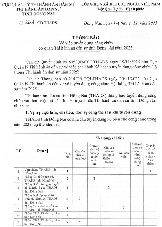 Thi hành án dân sự tỉnh Đồng Nai (THADS) thông báo tuyển dụng công chức vào làm việc tại các đơn vị trực thuộc Thi hành án dân sự tỉnh Đồng Nai như sau: