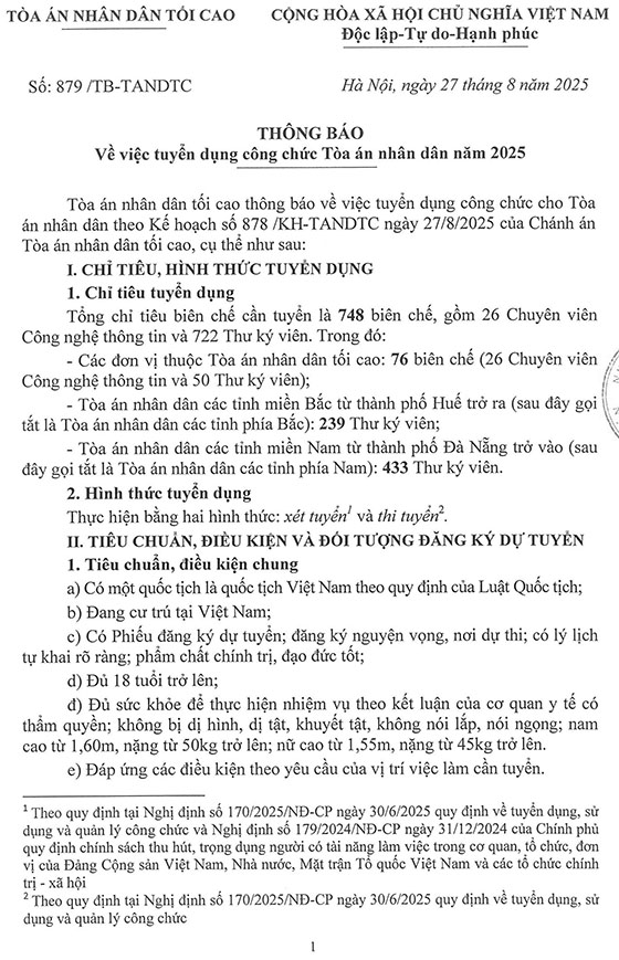 Tòa án nhân dân tối cao thông báo về việc tuyển dụng công chức cho Tòa án nhân dân theo Kế hoạch số 879/KH-TANDTC ngày 27/8/2025 của Chánh án Tòa án nhân dân tối cao, cụ thể như sau: