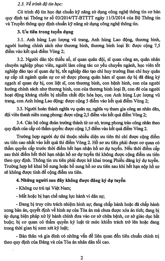 – Trình độ tin học: Có trình độ tin học đạt chuẩn kỹ năng sử dụng công nghệ thông tin cơ bản quy định tại Thông tư 03/2014/TT-BTTTT ngày 11/3/2014 của Bộ Thông tin và Truyền thông quy định chuẩn kỹ năng sử dụng công nghệ thông tin.