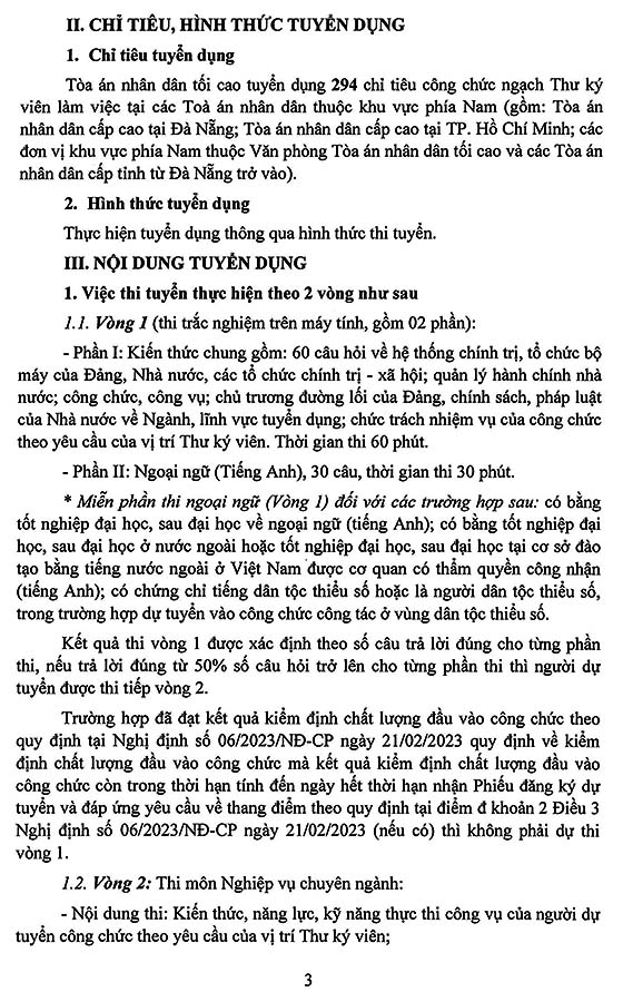 Tòa án nhân dân tối cao vừa ban hành thông báo tuyển dụng 294 công chức ngạch Thư ký viên làm việc tại các Tòa án nhân dân thuộc khu vực phía Nam, bao gồm Tòa án nhân dân cấp cao tại Đà Nẵng, Tòa án nhân dân cấp cao tại TP. Hồ Chí Minh, các đơn vị thuộc Văn phòng Tòa án nhân dân tối cao khu vực phía Nam và các Tòa án nhân dân cấp tỉnh từ Đà Nẵng trở vào.
