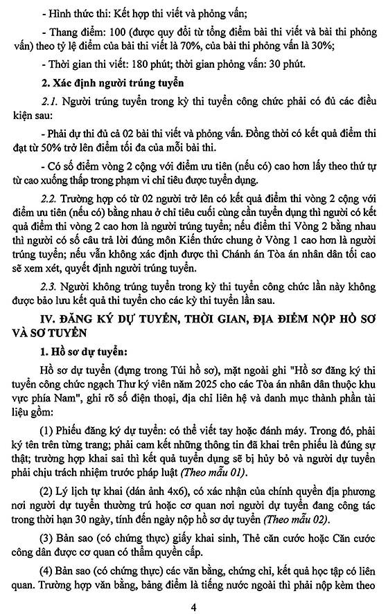 – Người có đủ các điều kiện sau đây không phân biệt dân tộc, nam, nữ, thành phần xã hội, tín ngưỡng, tôn giáo được đăng ký dự tuyển vào làm việc tại Tòa án nhân dân các cấp thuộc khu vực phía Nam: Có một quốc tịch là quốc tịch Việt Nam; Đủ 18 tuổi trở lên; Có Phiếu đăng ký dự tuyển, lý lịch rõ ràng được cơ quan có thẩm quyền xác nhận trong thời hạn 30 ngày, tính đến ngày nộp hồ sơ đăng ký dự tuyển; Có phẩm chất chính trị, đạo đức tốt; về lịch sử chính trị của bản thân và gia đình không vi phạm quy định của Tòa án nhân dân tối cao về công tác bảo vệ chính trị nội bộ; Đủ sức khoẻ để công tác theo kết luận của cơ quan y tế có thẩm quyền, không bị dị hình, dị tật, khuyết tật, không nói lắp, nói ngọng.