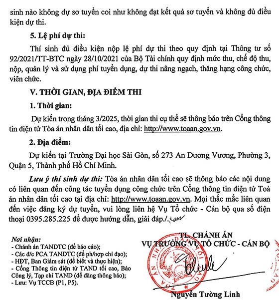 – Thời gian: Dự kiến trong tháng 3/2025, thời gian thi cụ thể sẽ thông báo trên Cổng thông tin điện tử Tòa án nhân dân tối cao, địa chỉ: http://www.toaan.gov.vn.