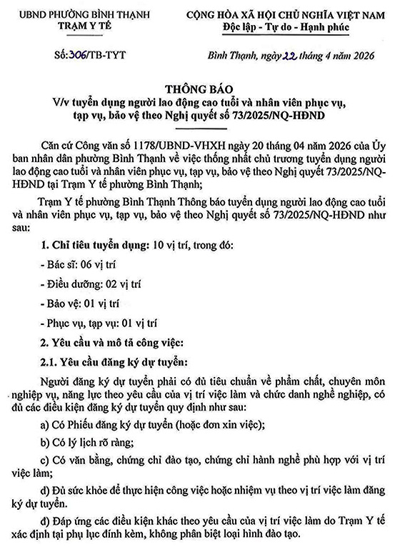 Trạm Y tế phường Bình Thạnh, TP. HCM tuyển dụng người lao động cao tuổi và nhân viên phục vụ, tạp vụ, bảo vệ theo Nghị quyết số 73/2025/NQ-HĐND cụ thể như sau: