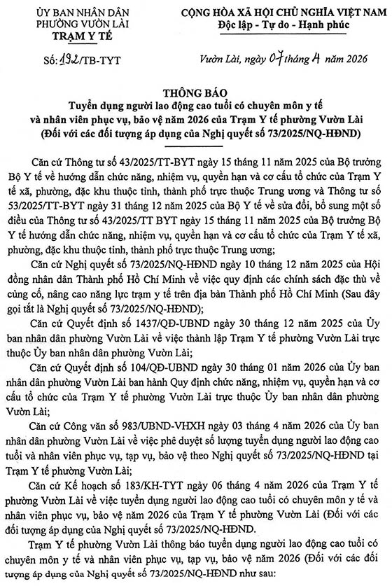 Trạm Y tế phường Vườn Lài thông báo tuyển dụng người lao động, cụ thể như sau: