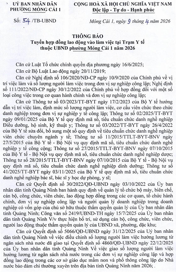 Thông báo tuyển hợp đồng vào làm việc tại Trạm Y tế thuộc UBND phường Móng Cái 1 năm 2026, như sau: