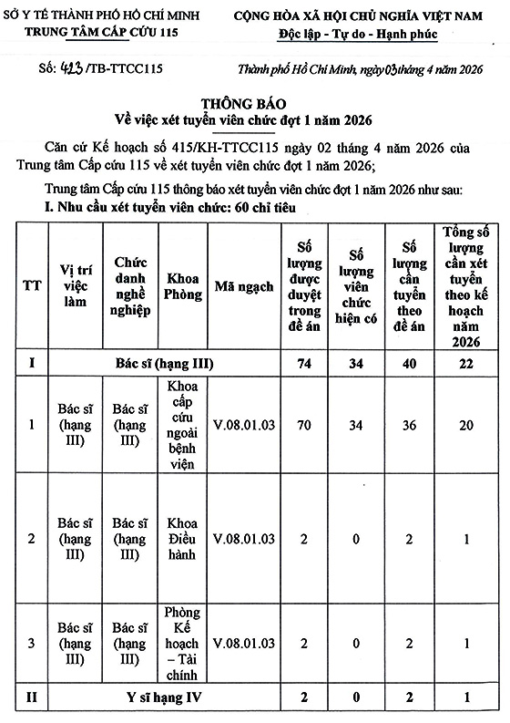 Trung tâm Cấp cứu 115 TP. HCM tuyển dụng viên chức đợt 1 năm 2026, như sau:
