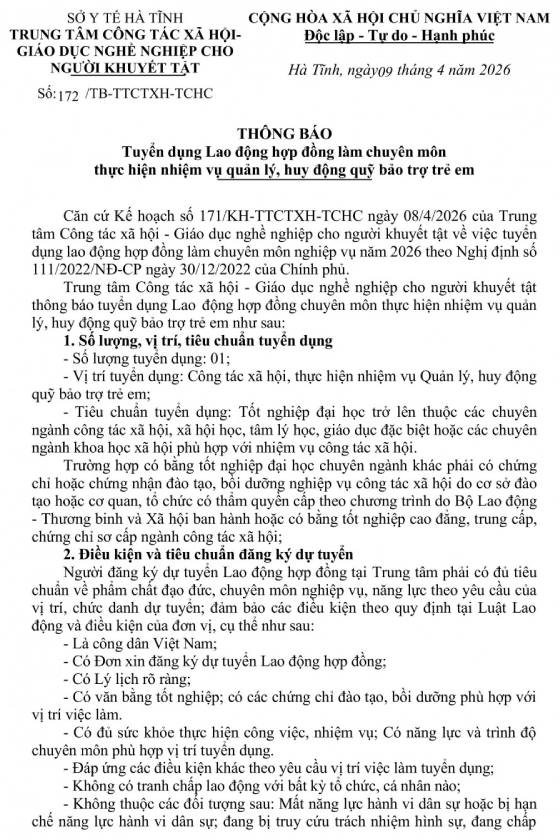 Trung tâm Công tác xã hội – Giáo dục nghề nghiệp Hà Tĩnh tuyển dụng Lao động hợp đồng