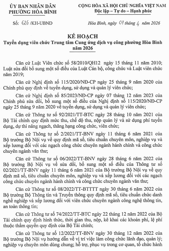 Căn cứ Kế hoạch số 626/KH-UBND ngày 07 tháng 4 năm 2026 của Ủy ban nhân dân phường Hòa Bình về tuyển dụng viên chức Trung tâm Cung ứng dịch vụ công phường Hòa Bình năm 2026;