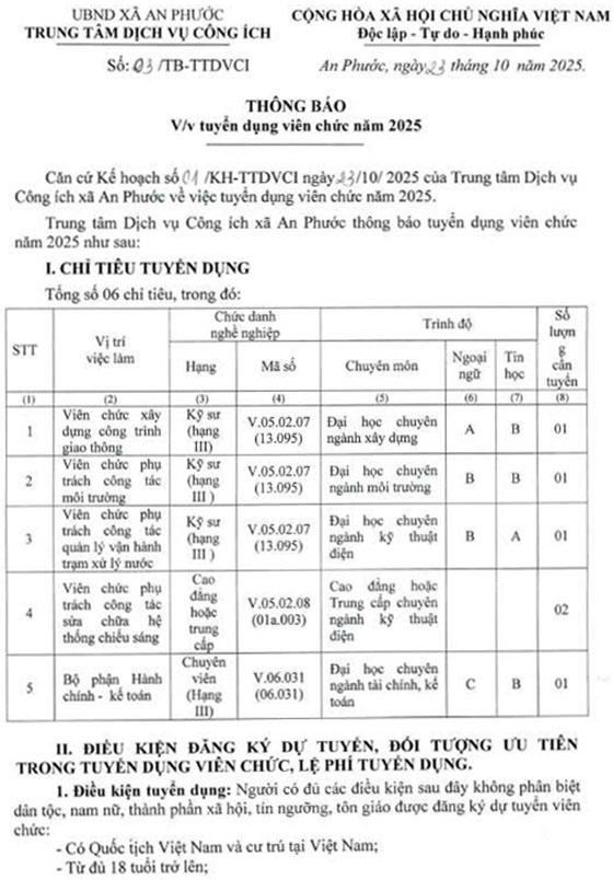 Trung tâm Dịch vụ Công ích xã An Phước thông báo tuyển dụng viên chức năm 2025 như sau: