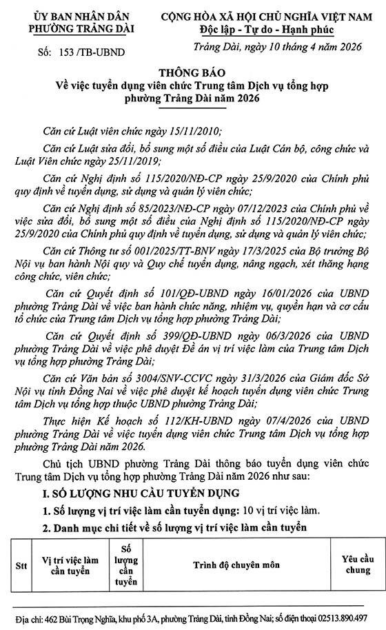 Thông Báo tuyển dụng viên chức Trung tâm Dịch vụ tổng hợp phường Trảng Dài năm 2026, như sau: