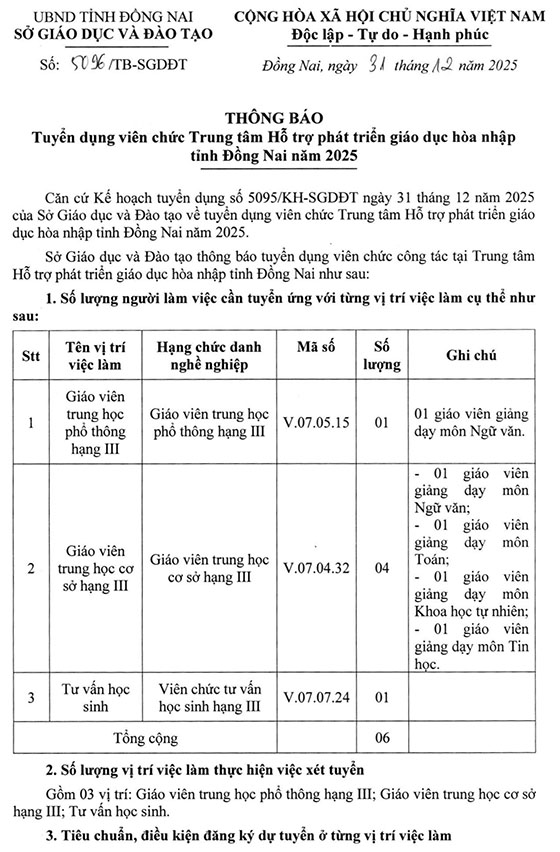 Thông báo tuyển dụng viên chức Trung tâm Hỗ trợ phát triển giáo dục hòa nhập, tỉnh Đồng Nai năm 2025, cụ thể như sau: