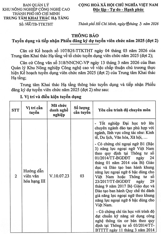 Trung tâm Khai thác Hạ tầng, BQL khu Công nghệ cao TP. HCM tuyển dụng viên chức năm 2025 (đợt 2)