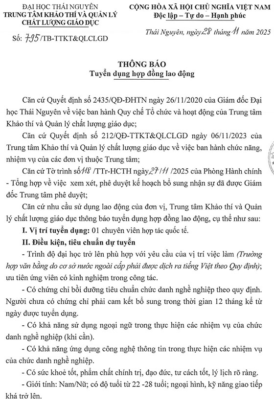 Trung tâm Khảo thí và Quản lý chất lượng giáo dục , Đại học Thái nguyên tuyển dụng hợp đồng lao động