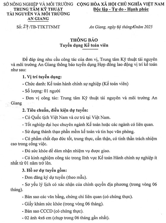 Để đáp ứng nhu cầu công tác của đơn vị, Trung tâm Kỹ thuật tài nguyên và môi trường An Giang thông báo tuyển dụng Hợp đồng lao động vị trí kế toán, như sau: